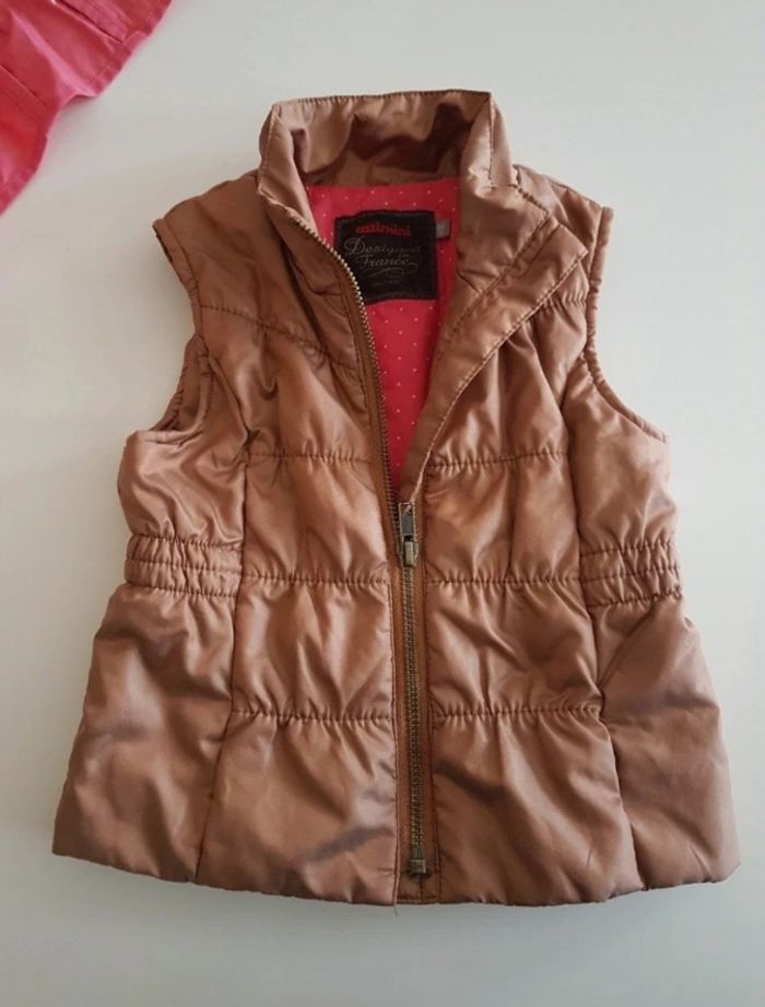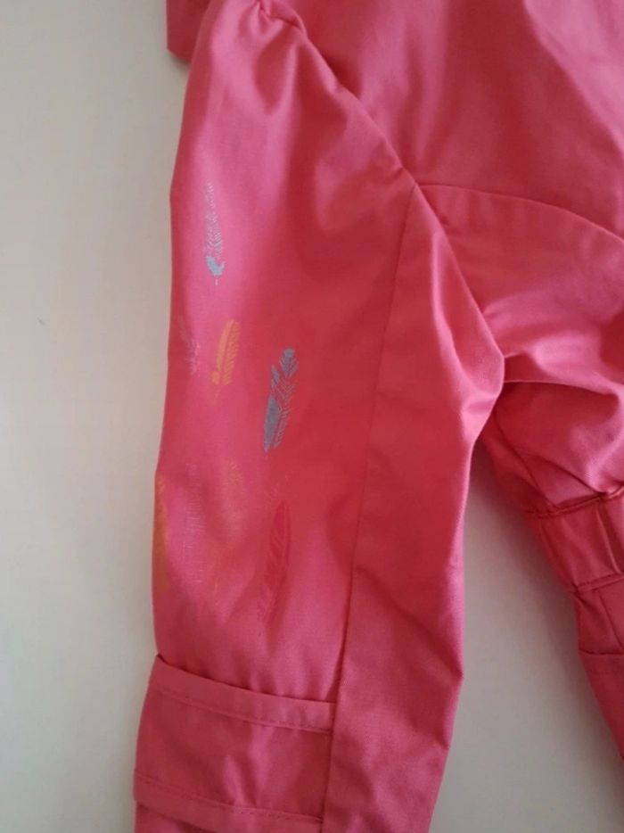 Veste pour la mi saison. La veste rose est un imperméable et se porte avec ou sans la doublure sans manches. La veste sans manche se porte seule aussi. Parfait état, très pratique. Motifs plume sur les manches cf photo 3
