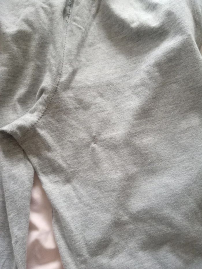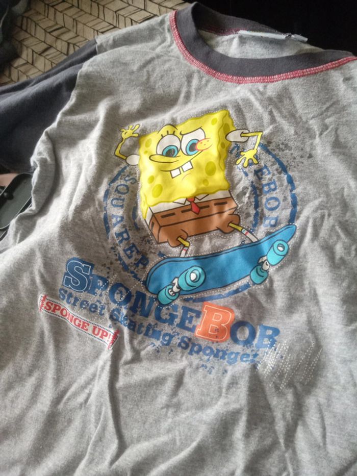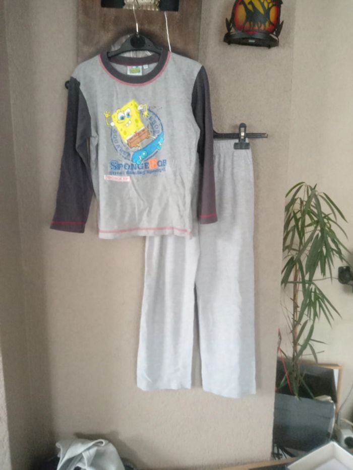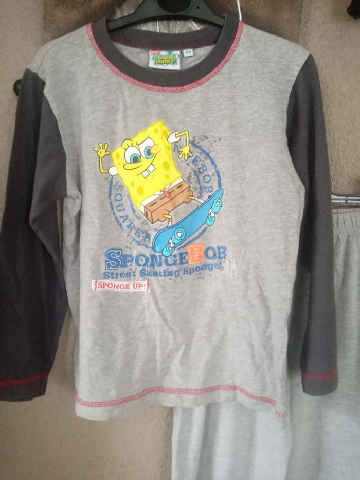 Pyjama fin garçon Bob l'éponge mais le bas est gris tout simple il a été repriser il avait un micro trou voir photo 4 et il a une auréole qui ne s enlève plus voir photo 5 je pense que le haut ne va pas avec le bas mais ça passe ( caisse 6 )