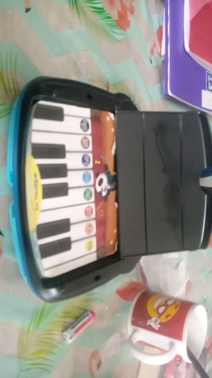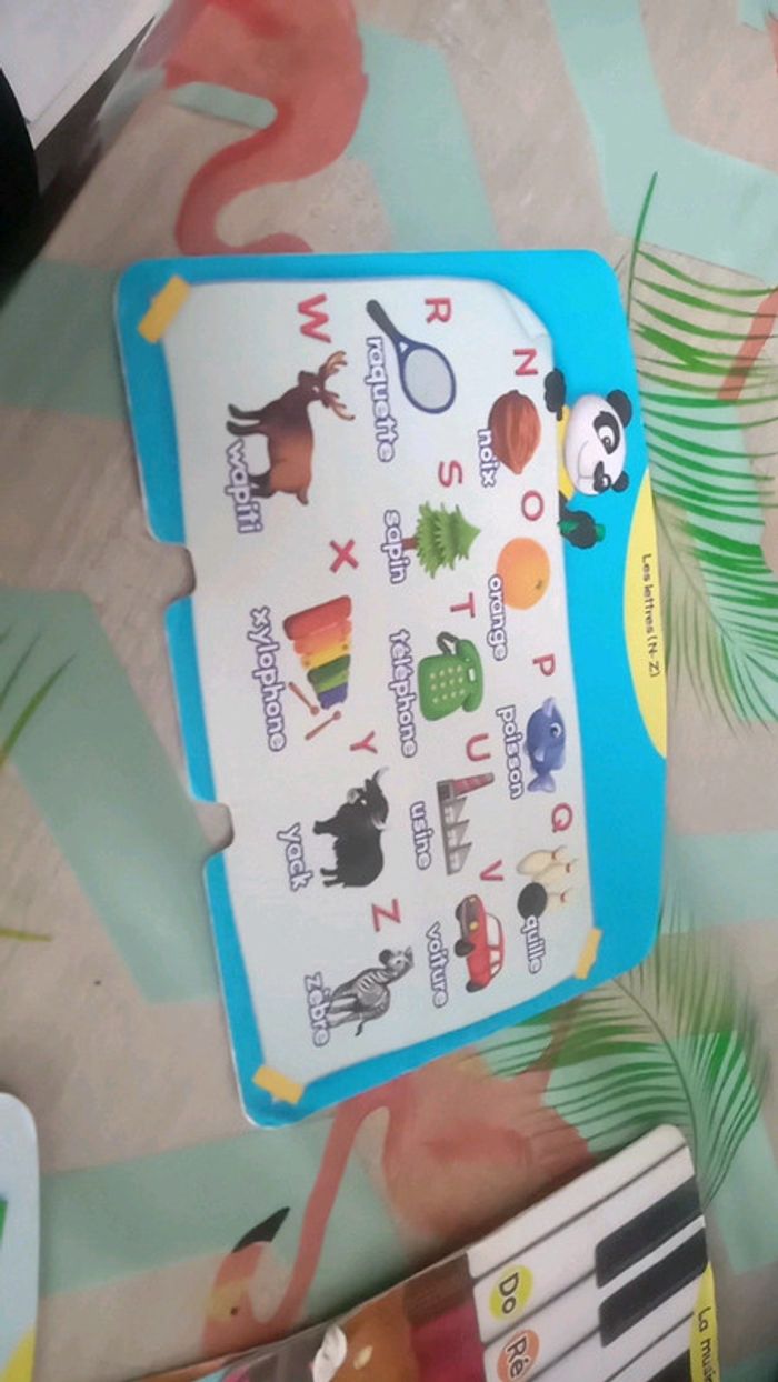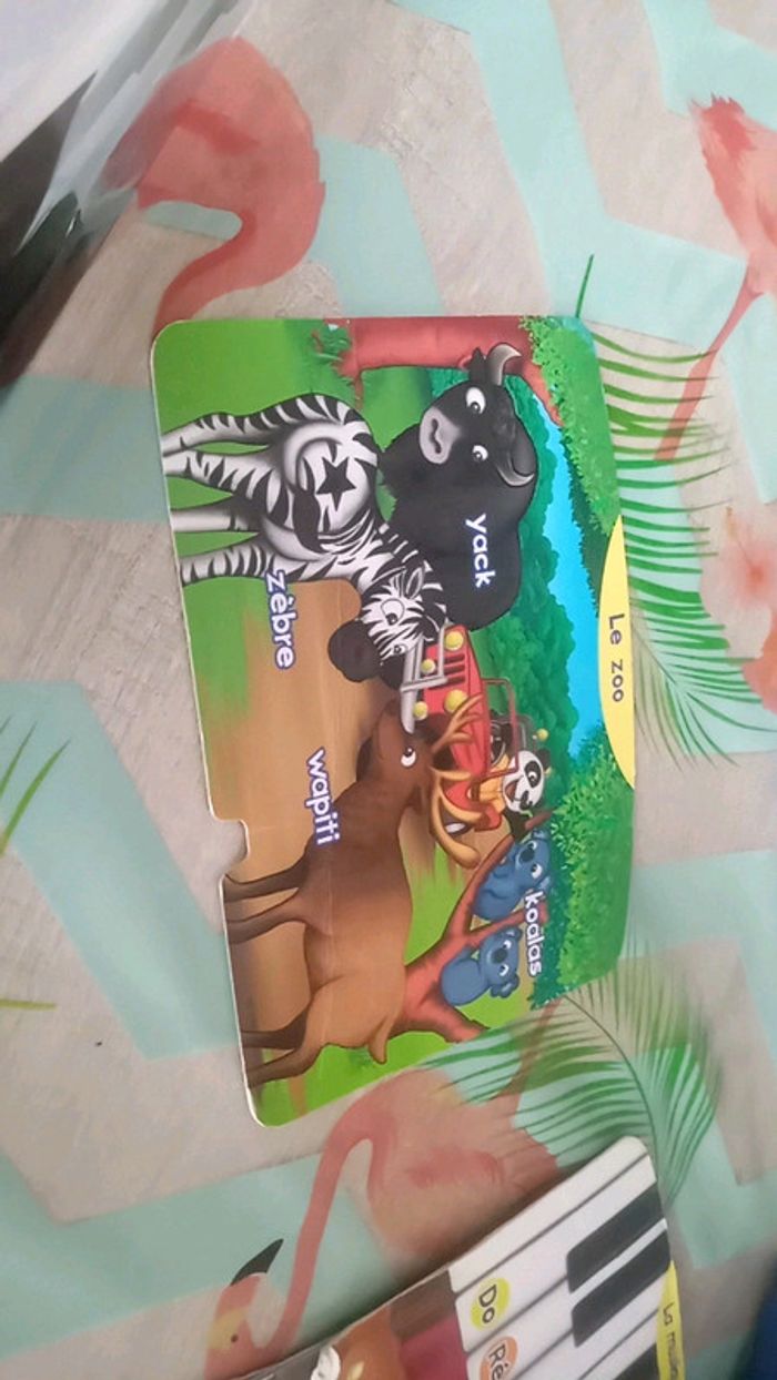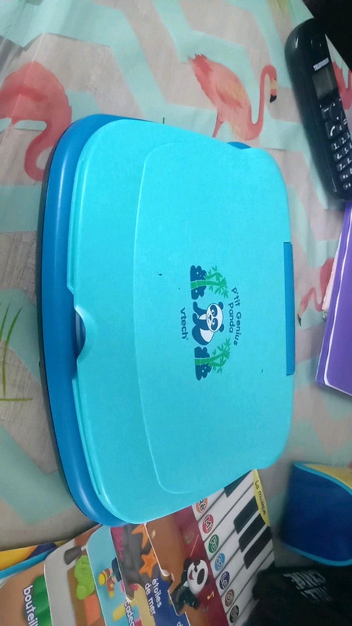 Ordi VTech qui a du vécu mais fonctionne très bien ,il y a 10 cartes recto-verso et les cartes de rangent dans l'ordi .Il y a une carte voir dernière photo qui a souffert mais elles sont un peu abîmés dans les coins du bas c'est normal elles se glissent dans l ordi ( bac jeux 1 )