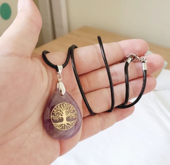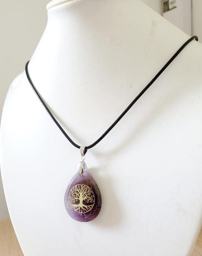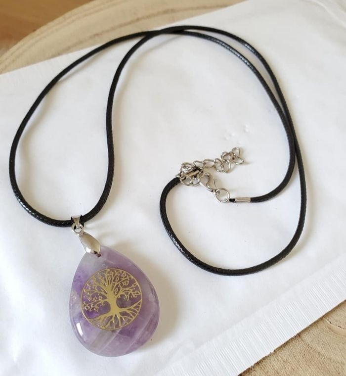 Collier pendentif mixte pierre naturelle Améthyste lithothérapie avec chaîne en cuir - Cordon cuir 45 cm L’améthyste est connue pour favoriser l’apaisement du mental. Elle permet aux personnes dépressives de se libérer du cycle infernal des pensées négatives qui les obsèdent. Cette pierre possède des propriétés qui purifient celui/celle qui la porte, lui offrant une plus grande ouverture d’esprit. L’améthyste est la pierre par excellence des personnes qui font souvent des rêves prémonitoires car elle les favorise en développant l’intuition. Le mental de la personne qui porte cette pierre sur elle sera en effet plus détendue de sorte de lui permettre de mieux capter les messages de subconscient.