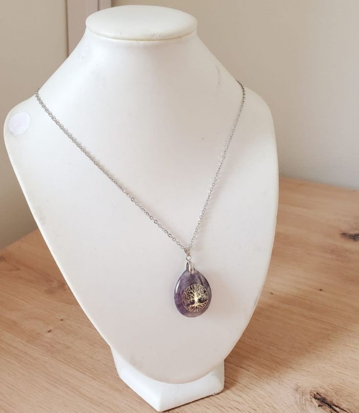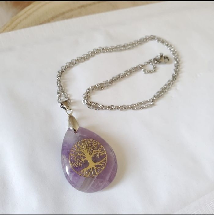 Collier pendentif mixte pierre naturelle Améthyste lithothérapie avec chaîne en acier inoxydable. - Chaine acier inoxydable 45 cm. L’améthyste est connue pour favoriser l’apaisement du mental. Elle permet aux personnes dépressives de se libérer du cycle infernal des pensées négatives qui les obsèdent. Cette pierre possède des propriétés qui purifient celui/celle qui la porte, lui offrant une plus grande ouverture d’esprit. L’améthyste est la pierre par excellence des personnes qui font souvent des rêves prémonitoires car elle les favorise en développant l’intuition. Le mental de la personne qui porte cette pierre sur elle sera en effet plus détendue de sorte de lui permettre de mieux capter les messages de subconscient.