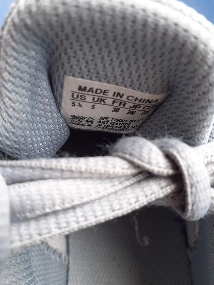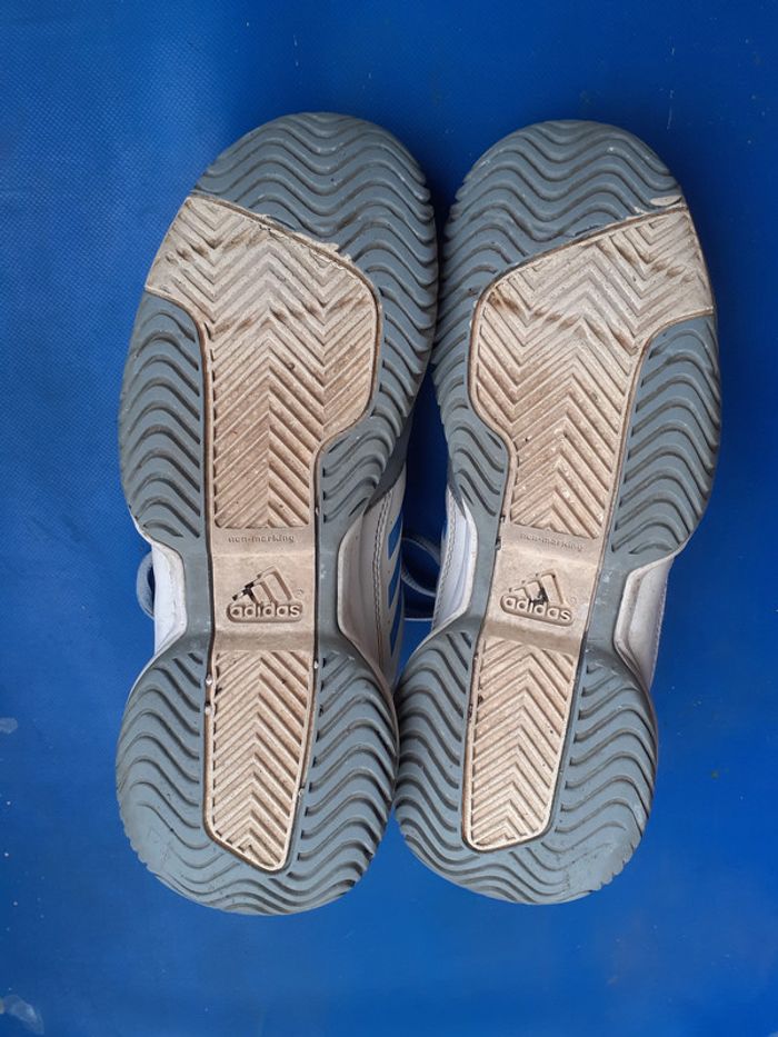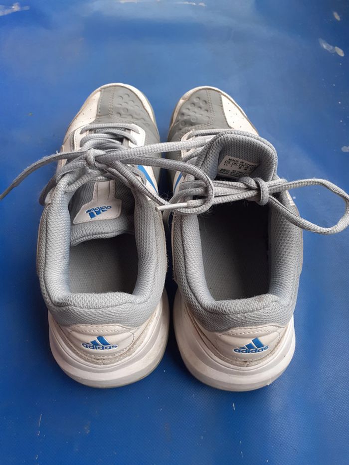 Baskets blanches-grises, avec bandes bleues de marque Adidas pointure 38 Excellent état.