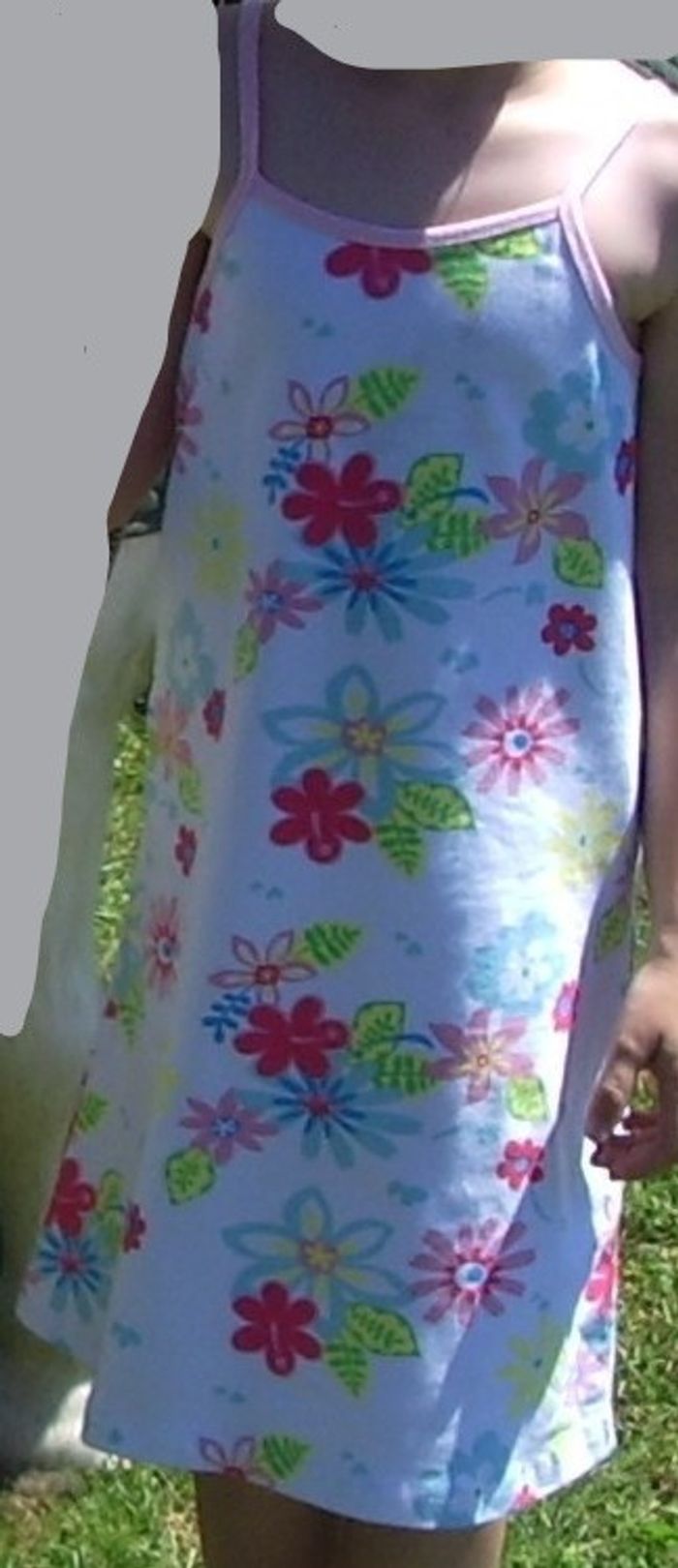 Robe à brides fond blanc, imprimés fleurs colorées, brides roses excellent état taille 6 ans