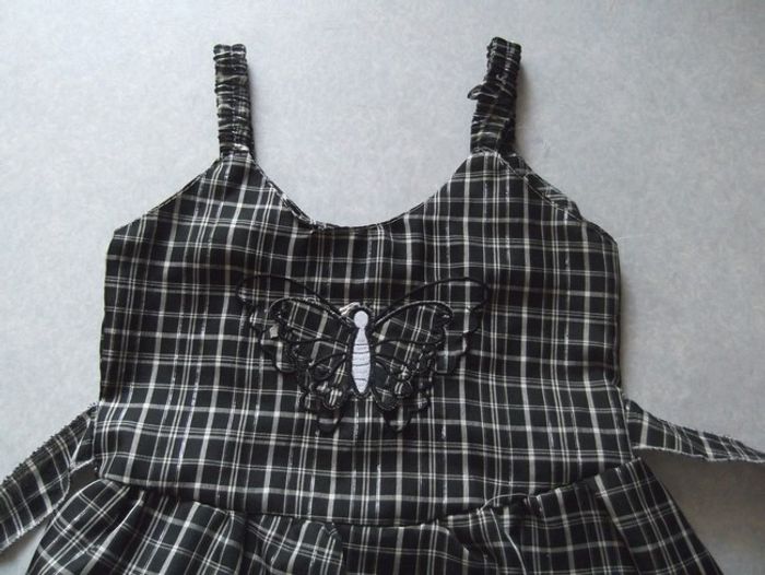 Robe à brides, avec ceinture laçage dans le dos avec volants (dessous blanc) noire à carreaux, avec impression "papillon" taille 10 ans