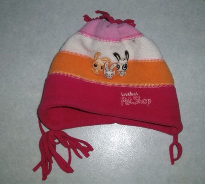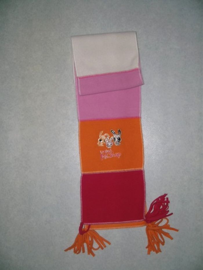 Lot 1 écharpe + 1 bonnet rayé orange/rose/beige tissu polaire de marque "Littlest PetShop" taille 6/8 ans.