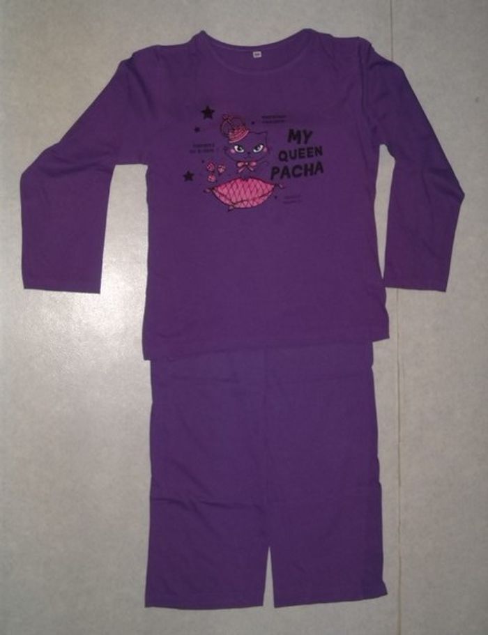 Pyjama violet 2 pièces, avec imprimé rose "queen pacha" sur le haut. Taille 10 ans.