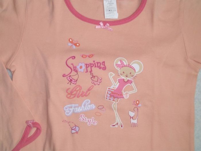 Pyjama 2 pièces : bas rose + haut orange avec imprimé "souris" et bords manches/col rose. Taille 6 ans.