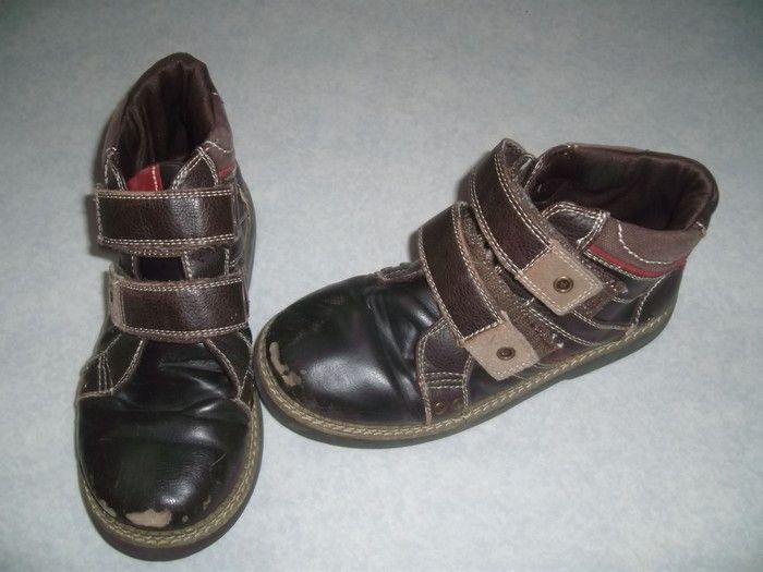 Chaussures montantes, marron, avec 2 bandes sur le devant à scratch. Un peu usées sur le devant. Pointure 35.