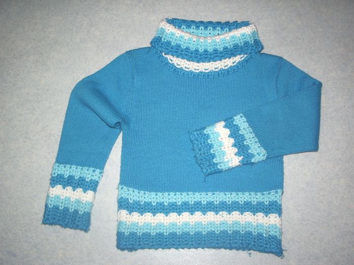 Pull à col roulé, bleu avec rayures ciel/blanc sur le col, le bas et les manches. Très chaud. Taille 4 ans.