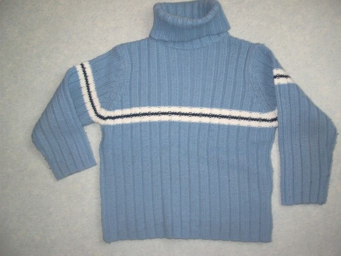 PULL en laine, col roulé, bleu ciel + bandes blanc/noir. Taille 6 ans.
