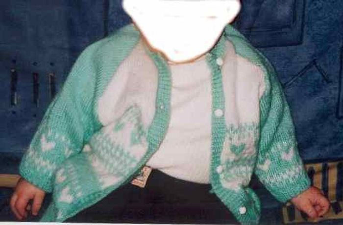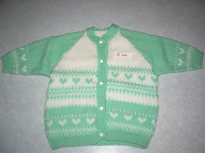 VESTE en laine, tricotée main, vert/blanc, petits coeurs. Fermeture par boutons ronds blancs. Taille 6 mois.