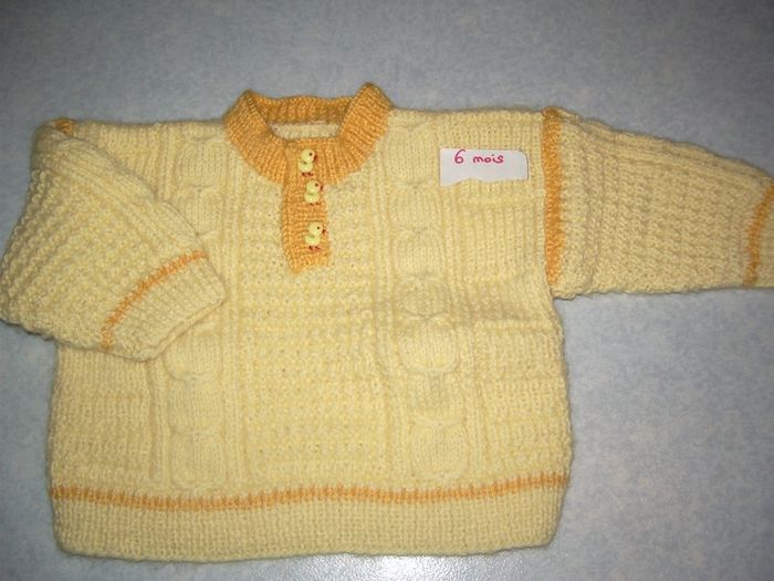 PULL manches longues, jaune pâle/jaune foncé, col rond avec boutonnage, boutons en forme de poussins. En laine, tricoté main, différents points. Taille 6 mois.