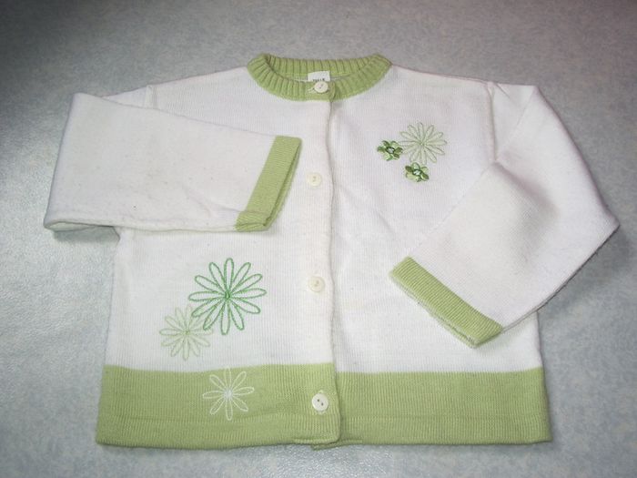 VESTE blanche, bord vert au col, manches et en bas, imprimés fleurs devant. Taille 3 ans.