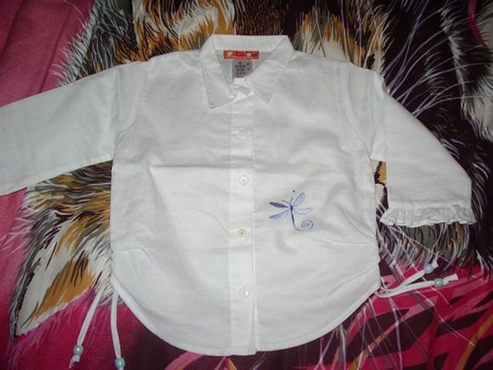 Chemisier blanc, manches 3/4. Bords des manches dentelés. Deux petites bandes de tissu sur le côté avec une perle. Imprimé "libellule" sur le côté. Taille 3 ans.