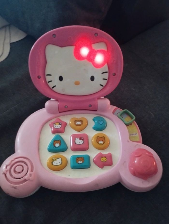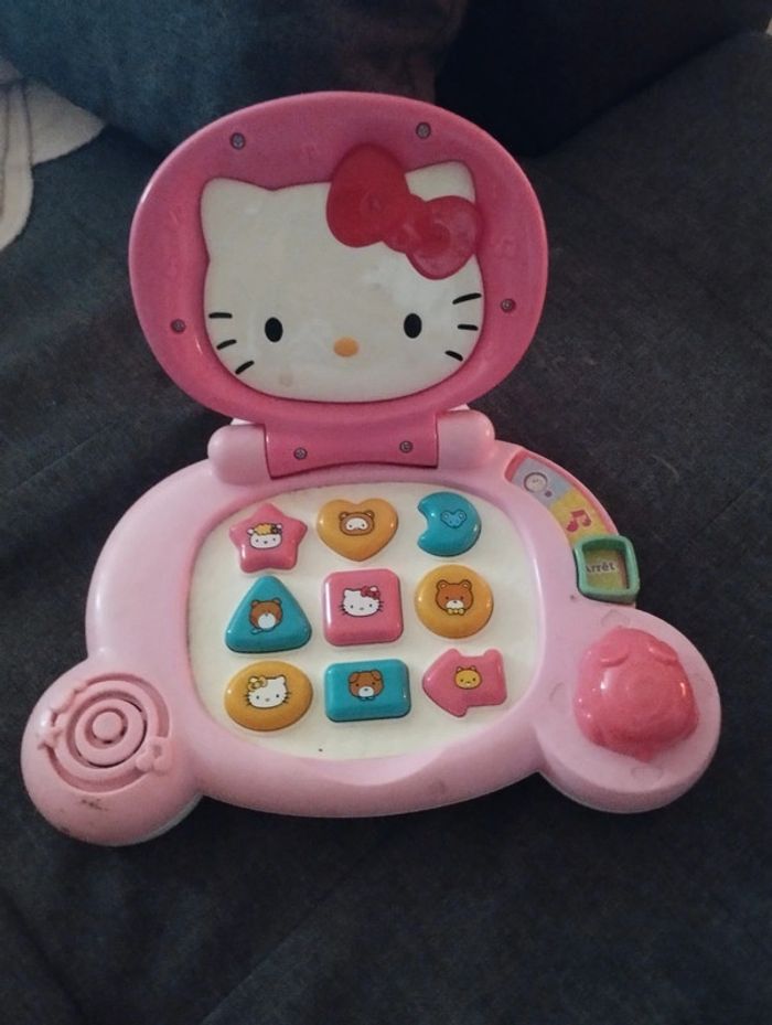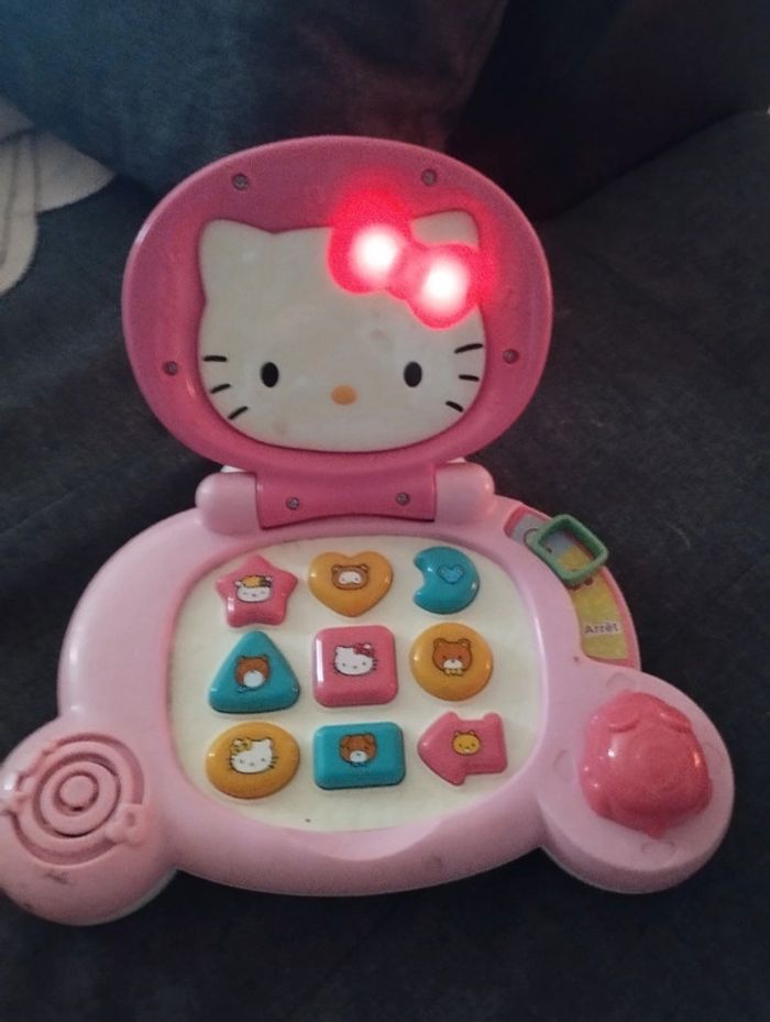 Vend ordinateur 1 er age hello Kitty Fonctionne Vendu avec pile Traces d'usure mais reste en état satisfaisant. Sera nettoyer pour la vente.