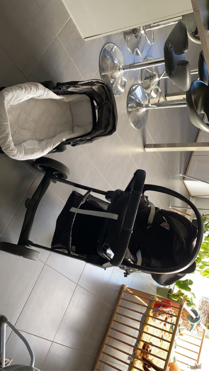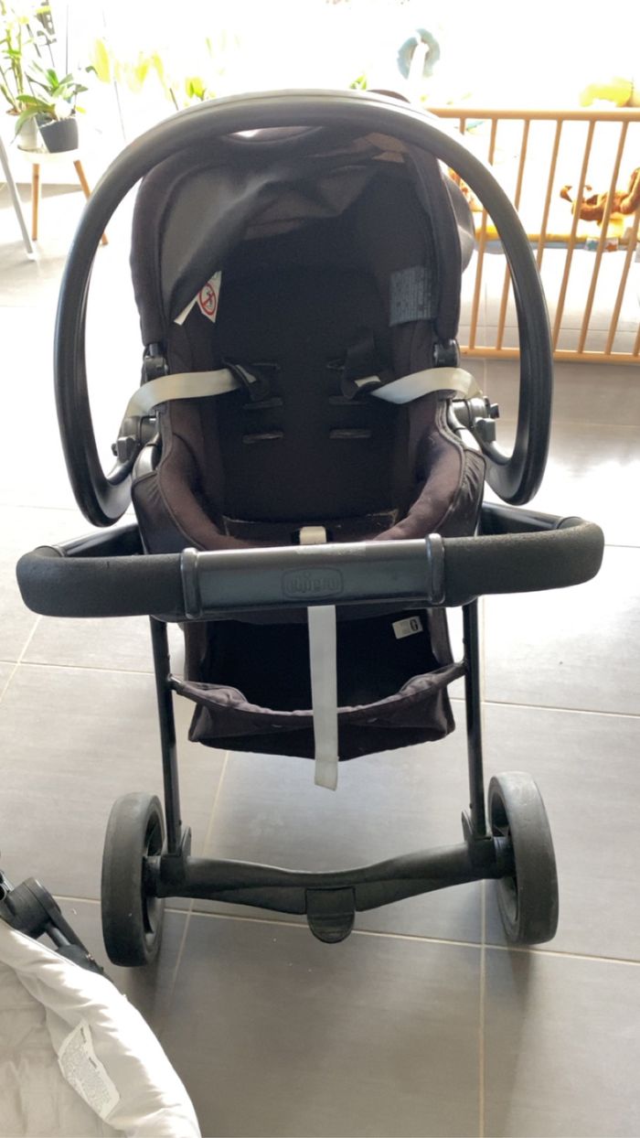 Poussette chicco 3 en 1 , nacelle , coque et siège . Fait siège auto avec l’auto fixe. Très bon état. Se met face route ou face à nous. Se pli pour la voiture.