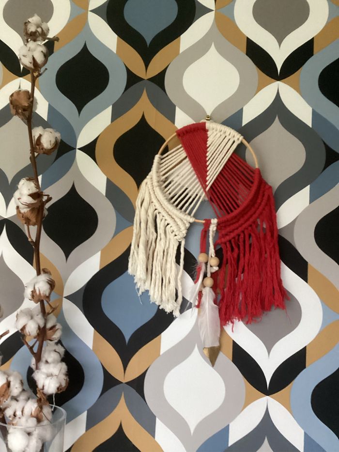 Attrape rêve bicolore rouge et blanc rehaussé de perles en bois et plumes Hauteur environ 37cm Diamètre environ 20cm Réalisé à la main #decobobo #ideecadeau #macramé