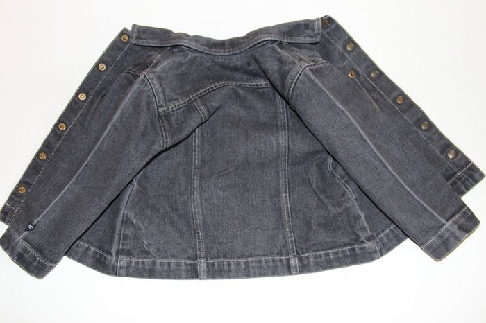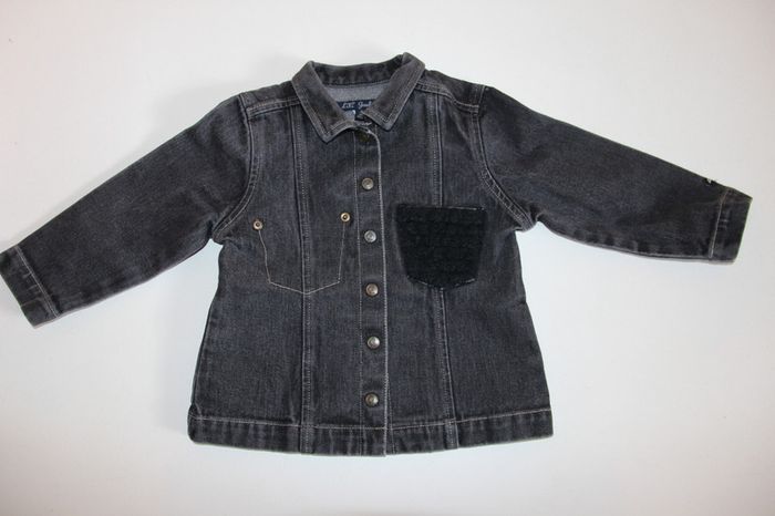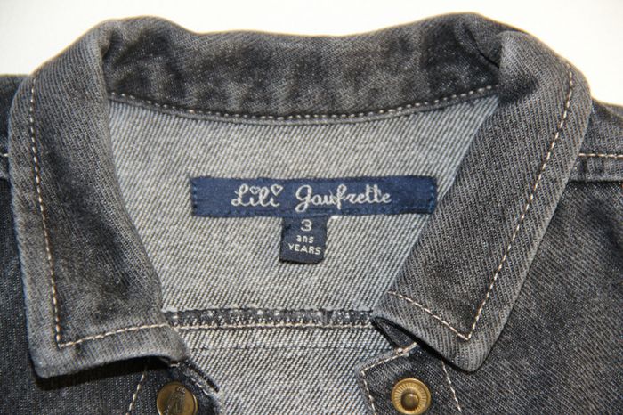 Veste en jeans Lili Gaufrette gris foncé/noir avec poche sur le devant en dentelle noir,en très bon état (juste la couleur est passé au niveau des plis sur les manches visible sur la dernière photo). Taille 3 ans #jessybibou3ans