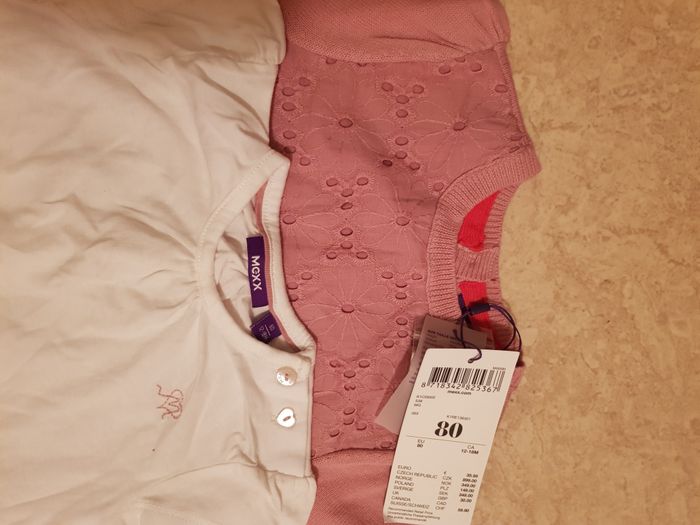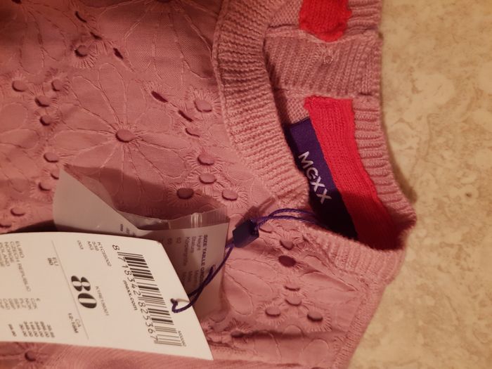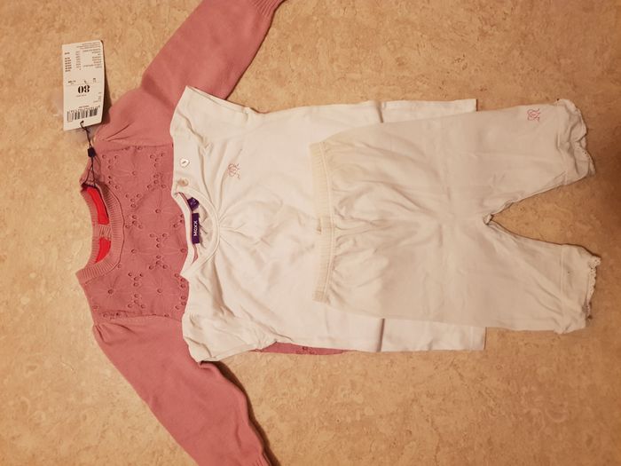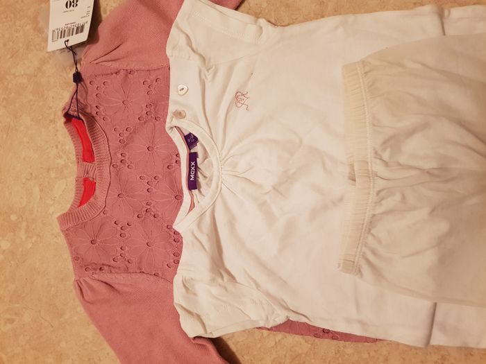 Ensemble Mexx bébé fille, pull encore étiqueté, t-shirt et legging porté 2 fois. Le legging à jauni au niveau de l'élastique.