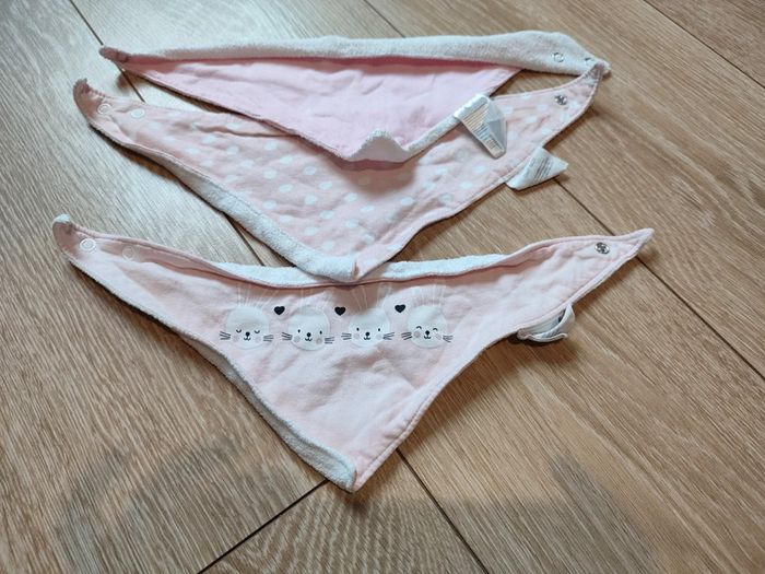 Lots de 3 bavoirs bandanas un côté rose coton et un côté eponge. Les pressions fonctionnent, pas de taches