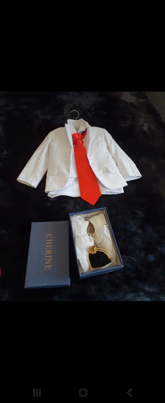 Bonjour je vend l'ensemble bapteme de mon fils porté 1h30 le temps de l'église le jour J. Ensemble short blanc+ chemise manche courte blanche + boléro blanc + veste manche longue blanche + 2 accesoires soit noeud pape rouge ou alors cravate rouge + chaussure mocassin enfant Taille 22 et une broche couronne pour le boléro. L'ensemble est en 2ans acheter 120€ le tout en magasin je le revend 85€ non negociable en superbe état. N'hésitez pas aller voir mon dressing 😊😊