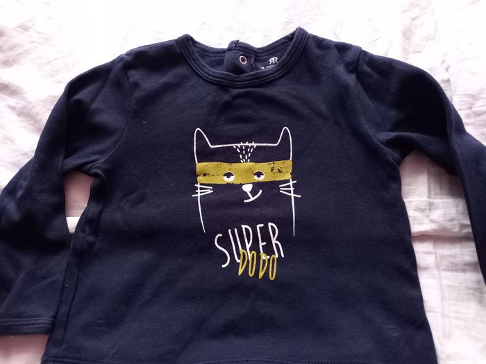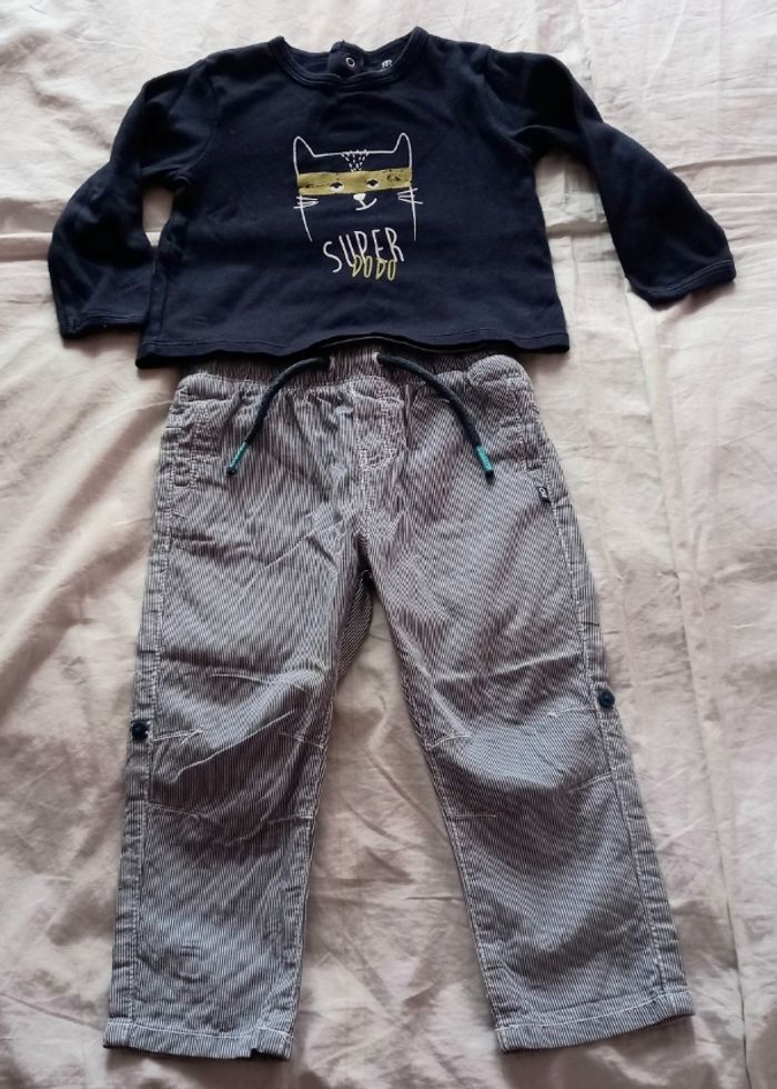 Ensemble 18 mois composé d'un tee shirt un peu épais, 3 pressions derrière + pantalon OBAIBI, taille élastiquée avec cordon réglable, poches devant et derrière