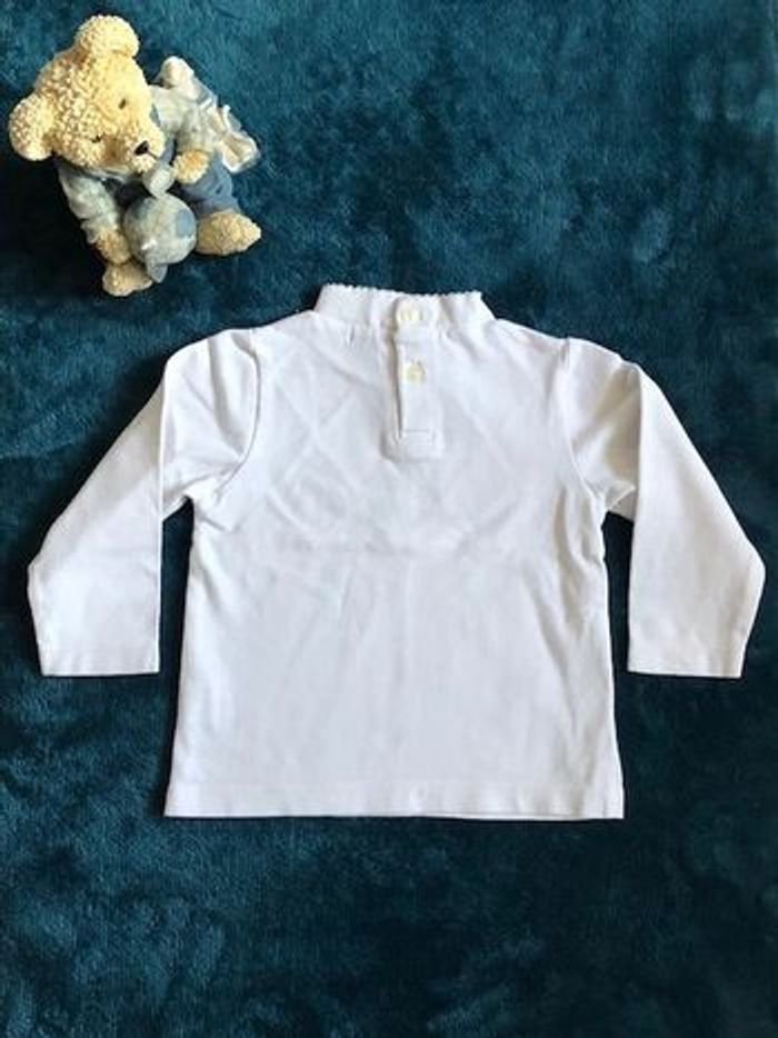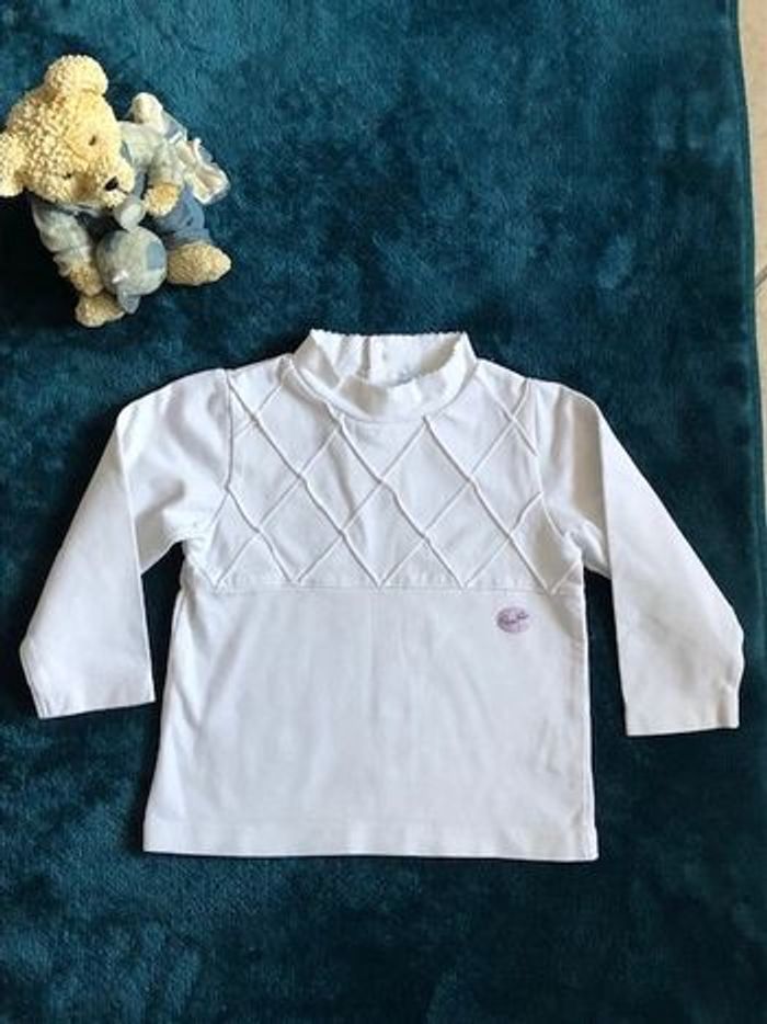 Haut blanc à manches longues, col cheminée Motifs losanges sur la partie haute Fermeture dos par 2 boutons Tissu stretch 95% coton, 5% élastane Très bon état #anso92000_fille18mois