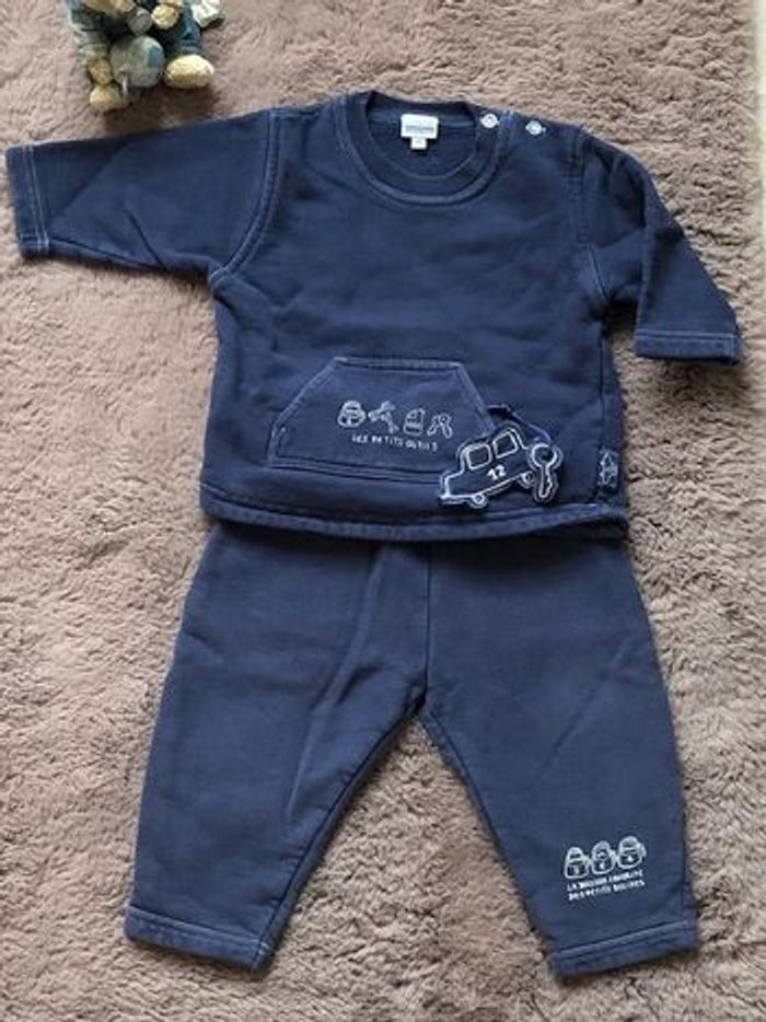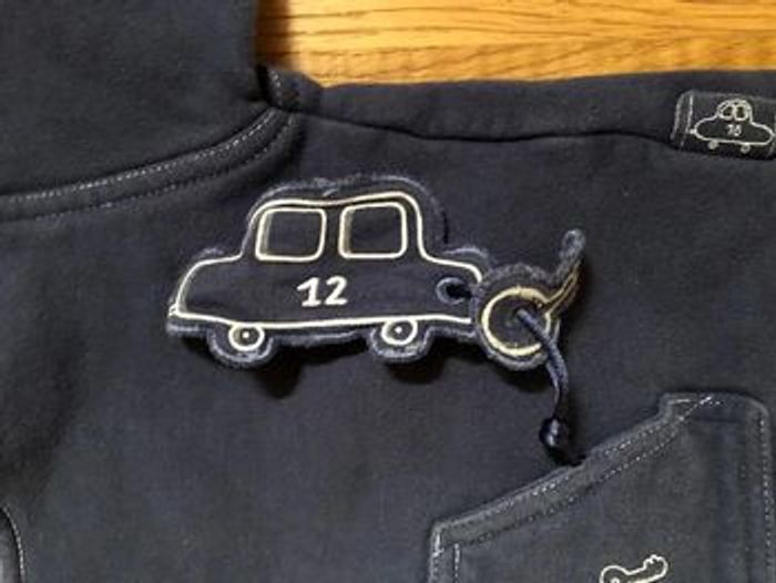Pantalon taille élastiquée Pull bleu marine fermant avec deux boutons au col Bleu marine Intérieur polaire Thème : les outils pour réparer une voiture Une voiture et une clé liées à un cordon se rangent dans la grande poche avant 100% coton #anso92000_garçon12mois
