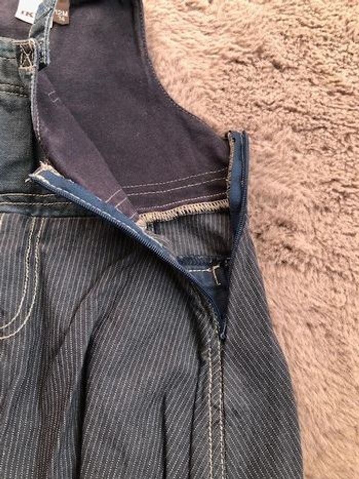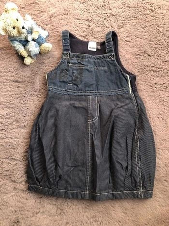 Robe à bretelles, fermeture à scratch 2 positions - haut avant: jean gris foncé - bas : gris foncé rayé - haut du dos : coton bleu marine avec logo IKKS en relief Fermeture éclair sur le côté gauche et petite bande dorée de chaque côté (photo 2) 100% coton Neuve #anso92000_fille12mois