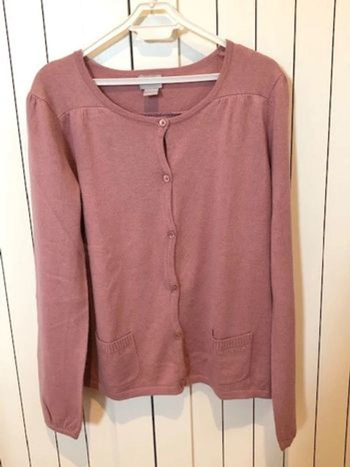 Gilet fin très doux de couleur vieux rose 2 poches sur l'avant 40% coton, 30% viscose, 21% polyamide, 9% angora Très bon état #anso92000fille12ans
