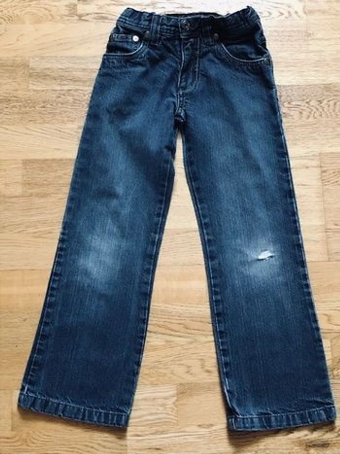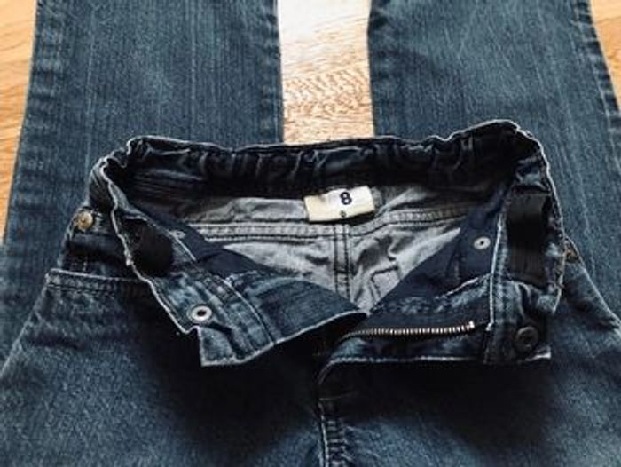 Jean bleu foncé Ceinture réglable par élastiques 100% coton Très bon état, l'"usure" sur la jambe gauche est d'origine #anso92000garçon8ans