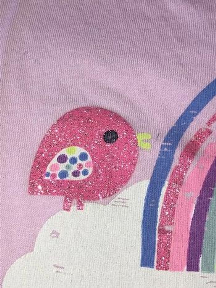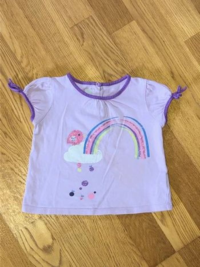 Tee shirt manches courtes, parme et violet Petit noeud à l'extrémité des manches Fermeture dos 3 boutons pression Motif oiseau et arc en ciel, avec des paillettes 100% coton Très bon état #anso92000_fille18mois