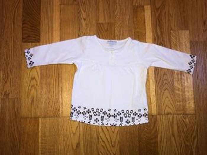 Tee shirt manches longues, blanc avec motifs fleurs marron aux extrémités Ouverture col 2 boutons 100% coton Très bon état #anso92000_fille12mois