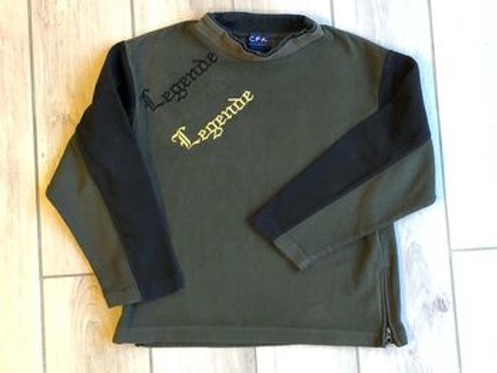 Kaki/vert foncé et noir Inscription « Légende » en noir et en doré Ouverture en bas de chaque côté grâce à fermetures éclair sur 10 cm (photo 3) 100% polyester Bon état #anso92000garçon8ans