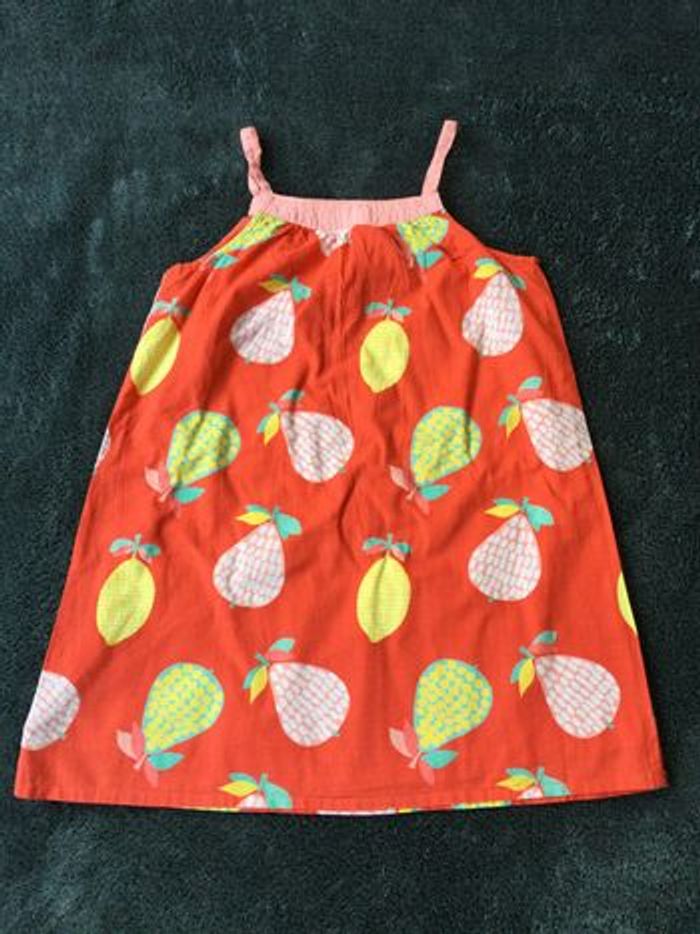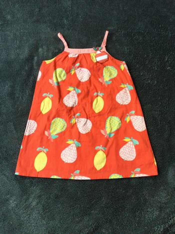 Très bon état Couleur orange, avec motifs fruits (poires, citrons) plus 1 poire en relief cousue sur le devant Robe très lumineuse, qui s’enfile par la tête Robe doublée 100% coton #anso92000fille6ans