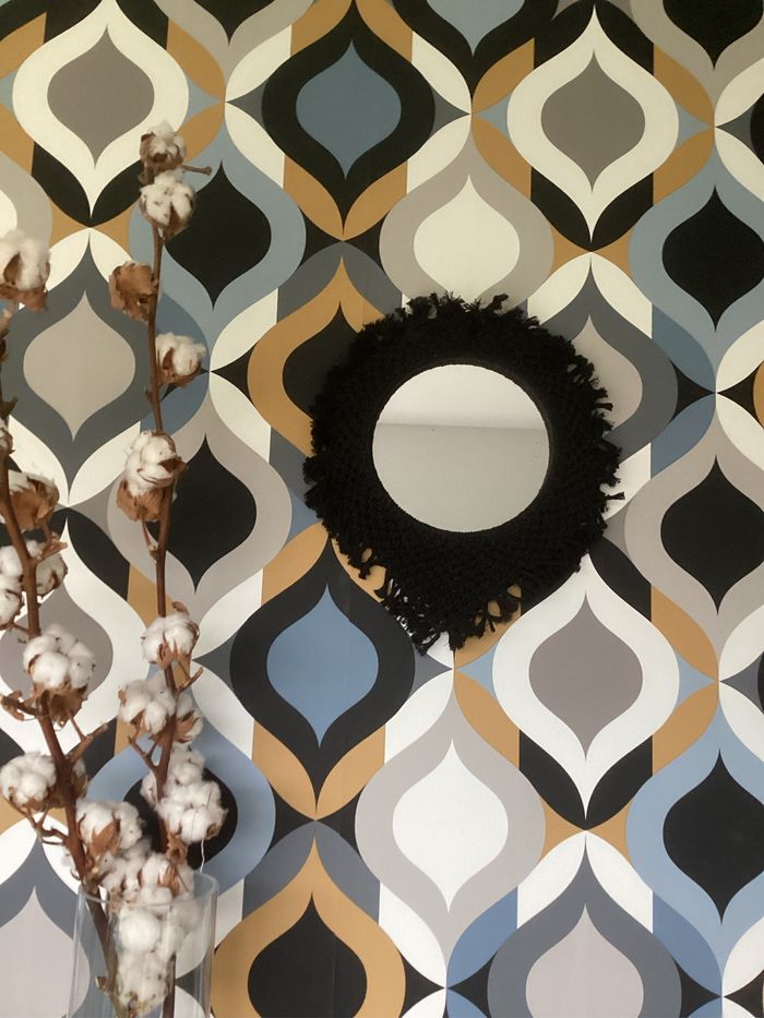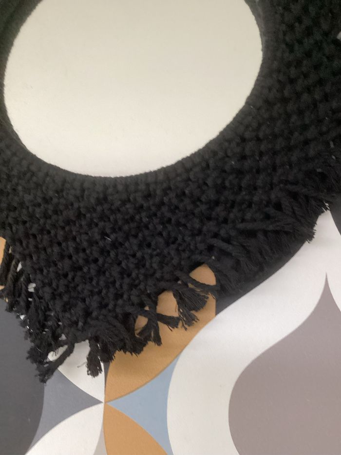 Couronne asymétrique noire hauteur 36cm largeur 31cm Miroir environ 19cm #ideecadeau #macrame #miroir #decoboho