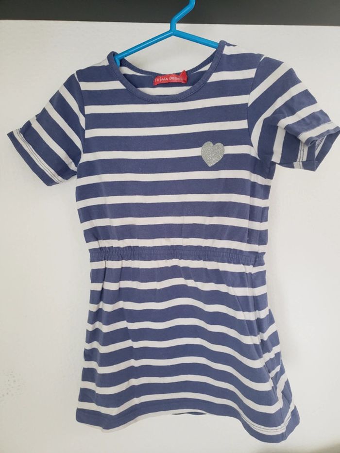 Rayée bleu et blanc avec petit coeur en paillettes argentée deja porté mais reste en bon etat. Ceinturée au niveau de la taille