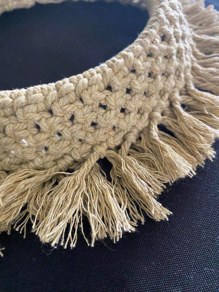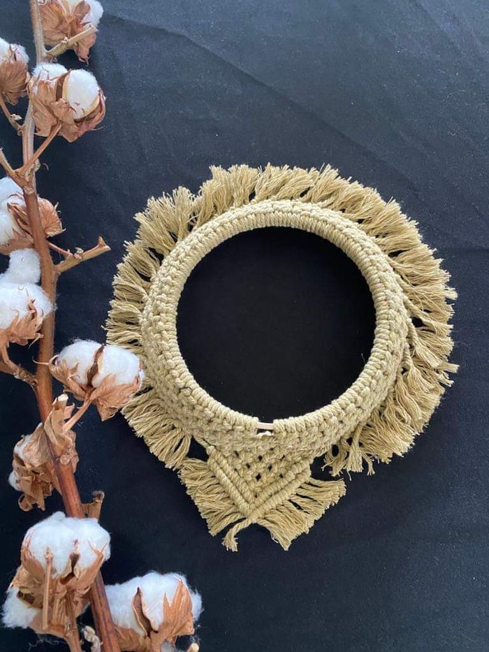 Couronne macramé faite main à poser ou accrocher Petit relief et asymétrie pour cette couronne mandala sable Hauteur 27cm largeur 26cm #decoboho #macrame #ideecadeau