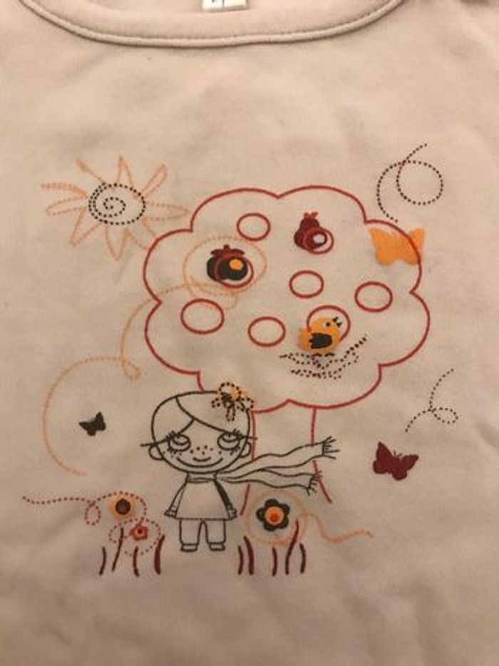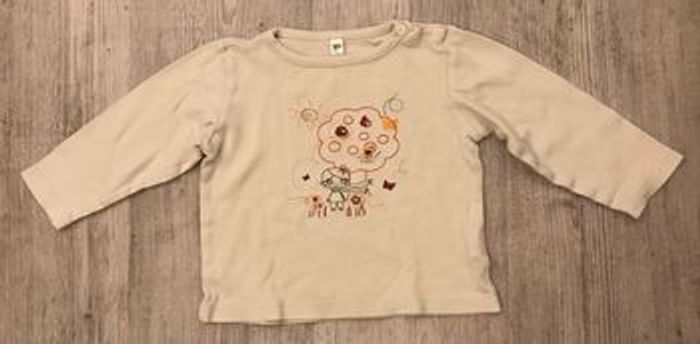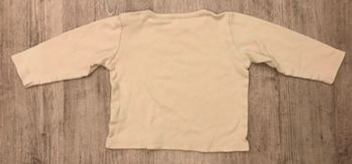 tee shirt à manches longues taille 18/24 mois (indiqué 36 mois sur l’étiquette mais taille très court aux manches) couleur blanc traces d’utilisation occasion, bon état