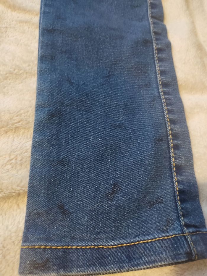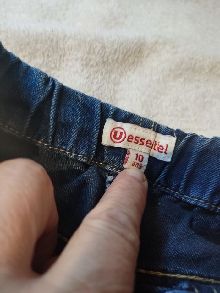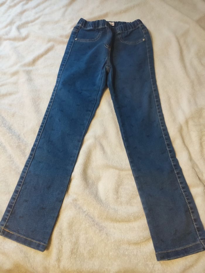 Pantalon jean bleu Élastique. Comme neuf. Je suis pas sur que ma fille la porte 1 fois. Motif sur tous le pantalon noir. 10ans
