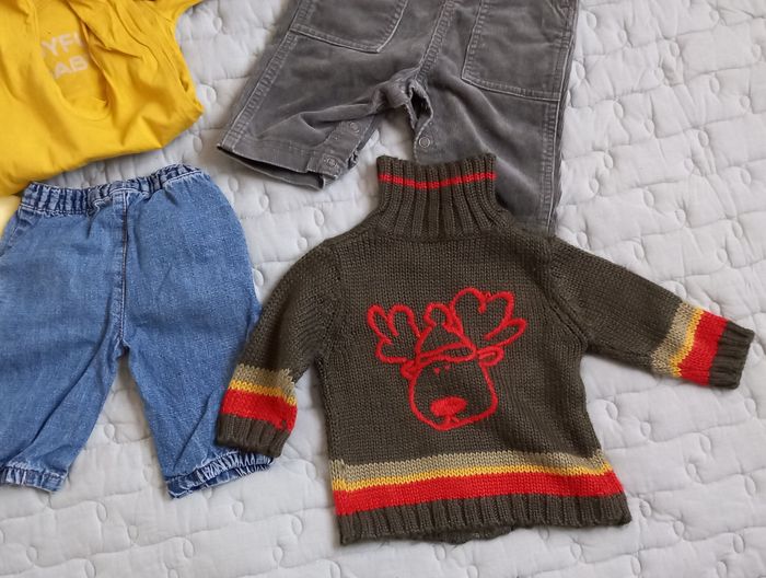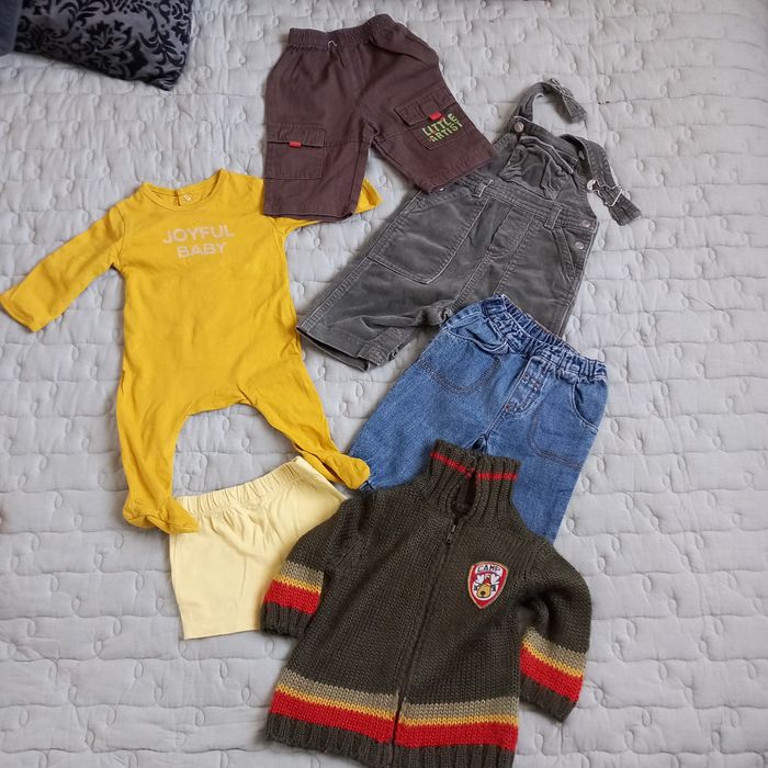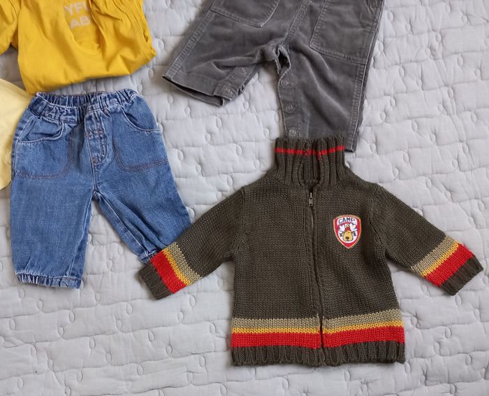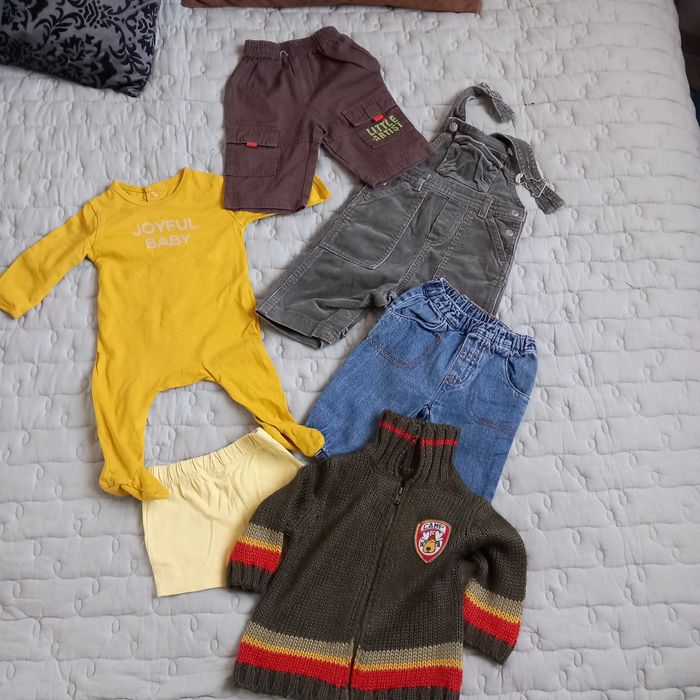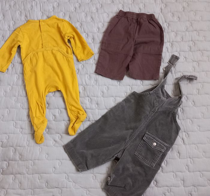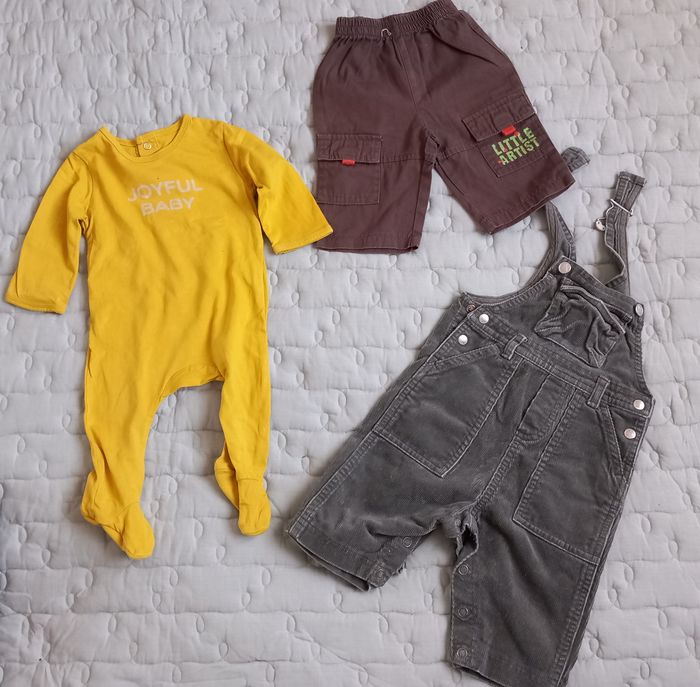 Salopette en velours Petit Bateau , Boutons pression sur les côtés, boutons pression à l'entrejambe, 3 poches, 100% coton Pantalon large élastique à la taille, 2 poches avec revers, coloris marron, 100% coton Pantalon jeans large élastique à la taille, 2 poches, bas resserré, 100% coton Shorty coloris jaiune, large élastique à la taille Veste en laine, manches longues, zip, col, écusson et broderie rennes dans le dos, 100% acrylique Grenouillère manches longues, Kiabi, 100% COTON éco conception, inscription imprimée devant Joyful baby, boutons pression au dos Possibilité d'offre en lots. Envoi rapide et soigné