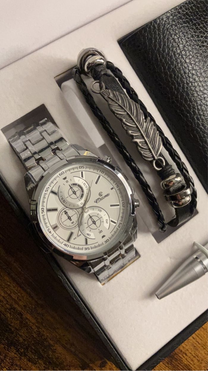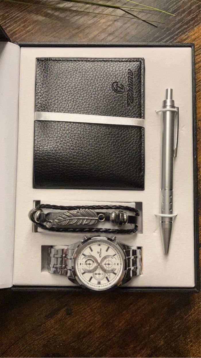 - 3 coffrets achetés le 4eme est GRATUIT ! 😀 ⚙️ Caractéristiques : - Montre Quartz neuve acier inoxydable (pile neuve) Durée de vie de la pile : 28 mois - Bracelet en simili cuir - Porte feuille cartes identités et autres - Stylos Bille 🚛 Emballage et Envoi : - Préparation et envoi de votre commande sous 24H MAX depuis nos locaux situés dans l’Oise