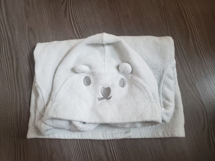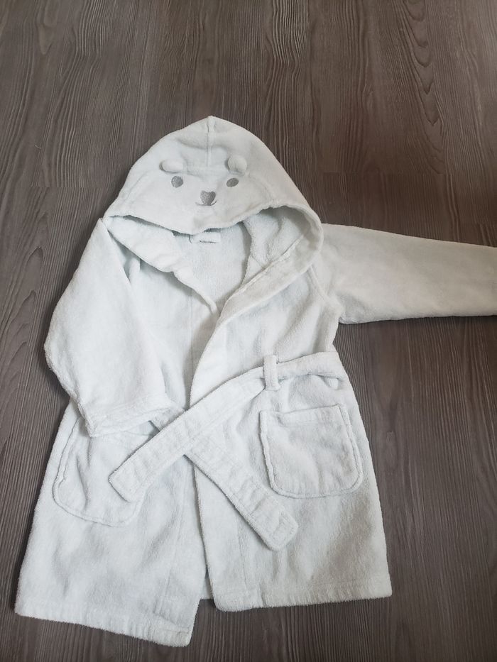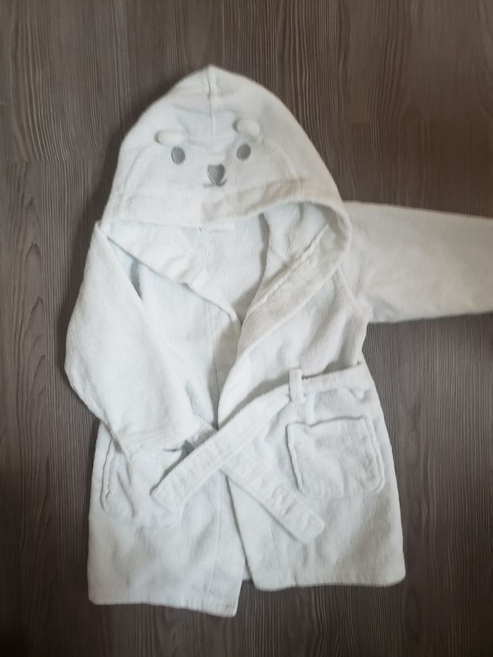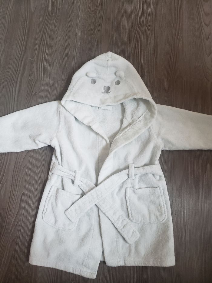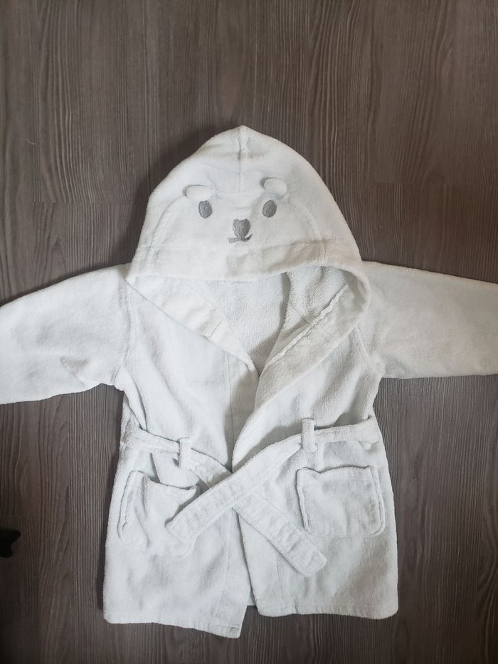 Joli peignoir blanc mixte, éponge à l'intérieur et velour à l'extérieur avec sa capuche ourson. Acheté à La Halle . Taille 18 mois. 1ère main. Tres très peu utilisée. Parfait état !