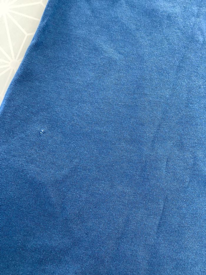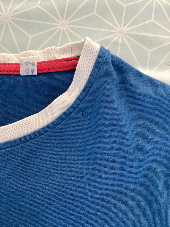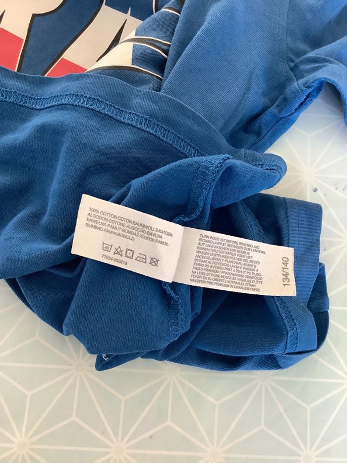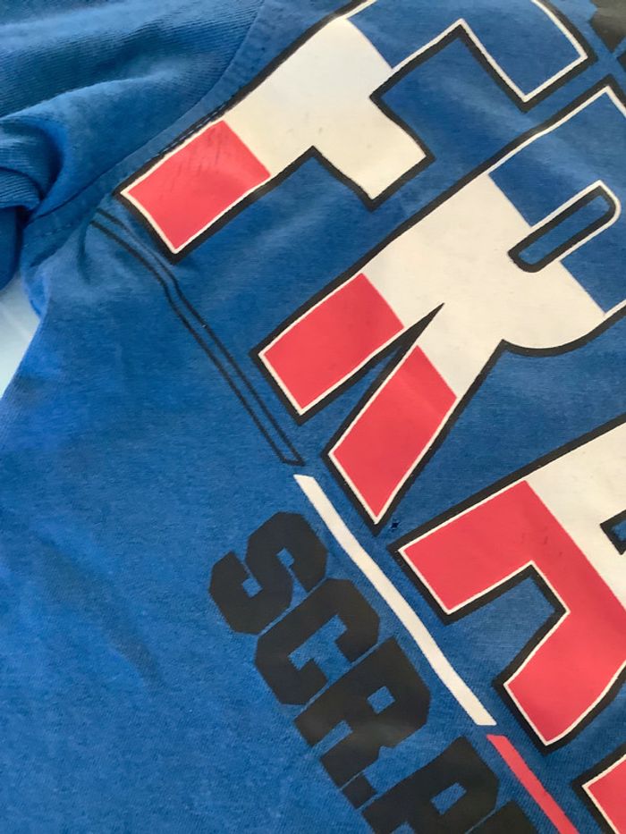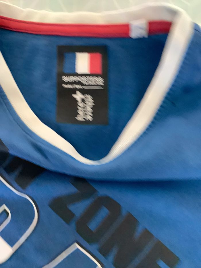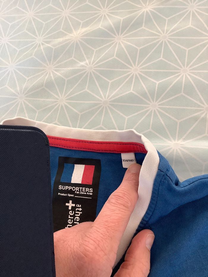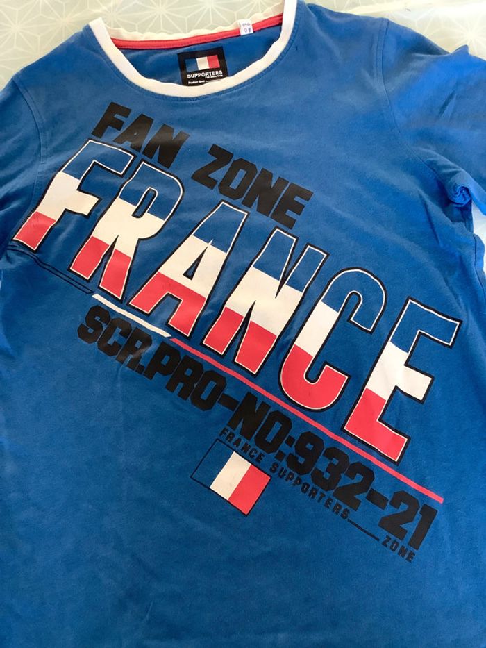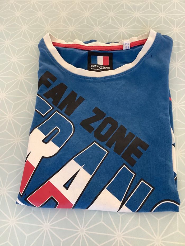 T-shirt bleu avec inscription « Fan zone France » Marque : Supporters Fan Zone Taille : 134/140 soit 10 ans environ 100% coton Porté plusieurs fois, trois petits accrocs (dont un recousu) et quelques marques sur l’inscription (voir photos) At51250