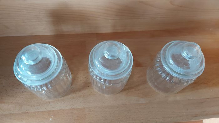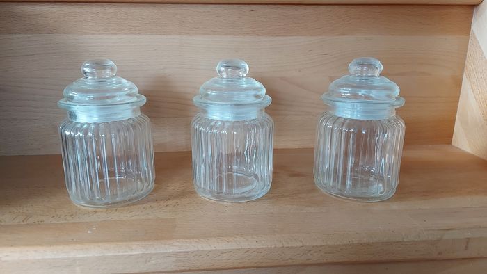 3 pots de conservation en verre, avec couvercles, ht tot 13 x diamètre 7,5 cm