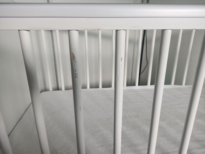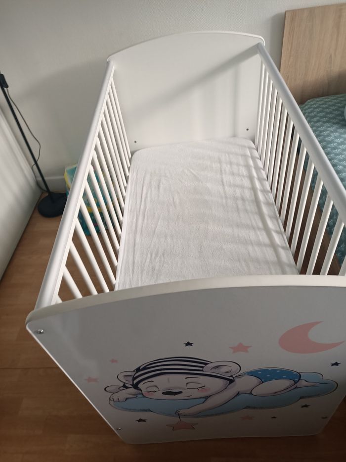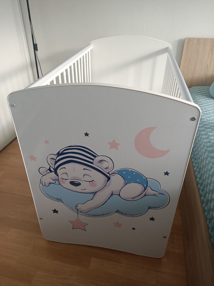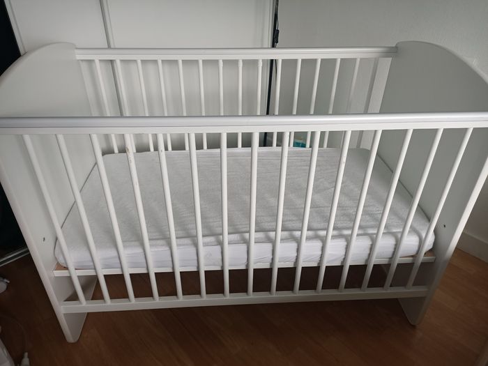 Berceau réglable sur 3 niveaux. 3 bar qui peut s'enlever pour le moment venu bébé puisse entré et sortir de son lit tous seul. Plastique de protection sur le berceau pour éviter les traces de dents.. Vend avec le matelas l'ensemble en bonne état général sauf ou y avait le mobile la peinture est un peut parti .. voir photo .. Vend le tous à 100€