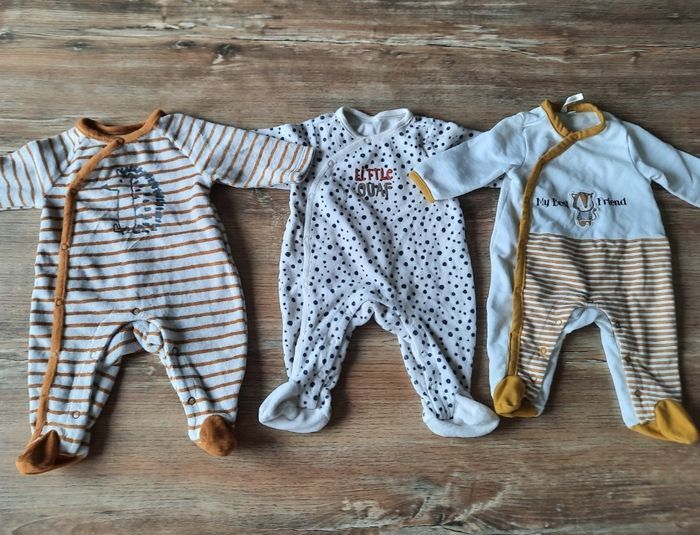 Lot de 6 pyjamas mixtes taille 1 mois dont 5 en velours. Le 6e est plus léger mais convient parfaitement avec un gilet même l'hiver. Ils s'ouvrent tous devant et aux jambes.