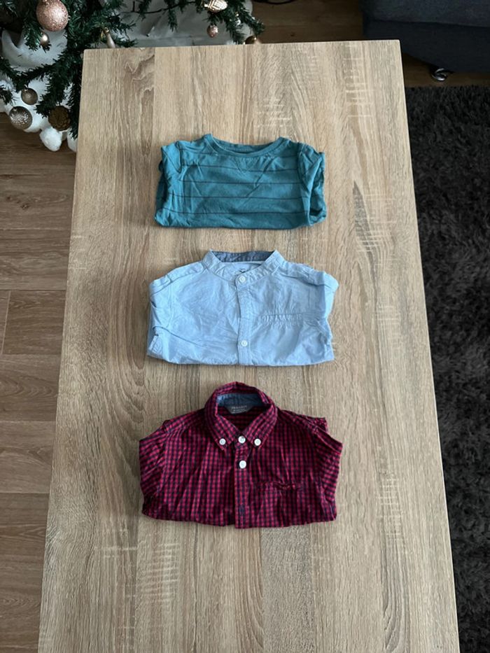 2 belles chemises taille 18-24 mois et un t-shirt Kiabi taille 2 ans . Les chemises sont comme neuf porté 1 fois