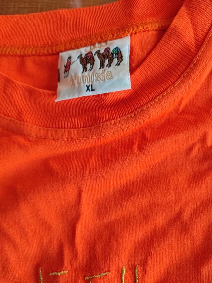 👗 Tee-shirt 🌸 Couleur orange fluo 🧷 Motif chameaux, inscription Tunisia dorée 🚼 Taille XL ✅ Peu porté, état neuf ⭐ Repassage avant envoi 😉 #cyboulette44femme