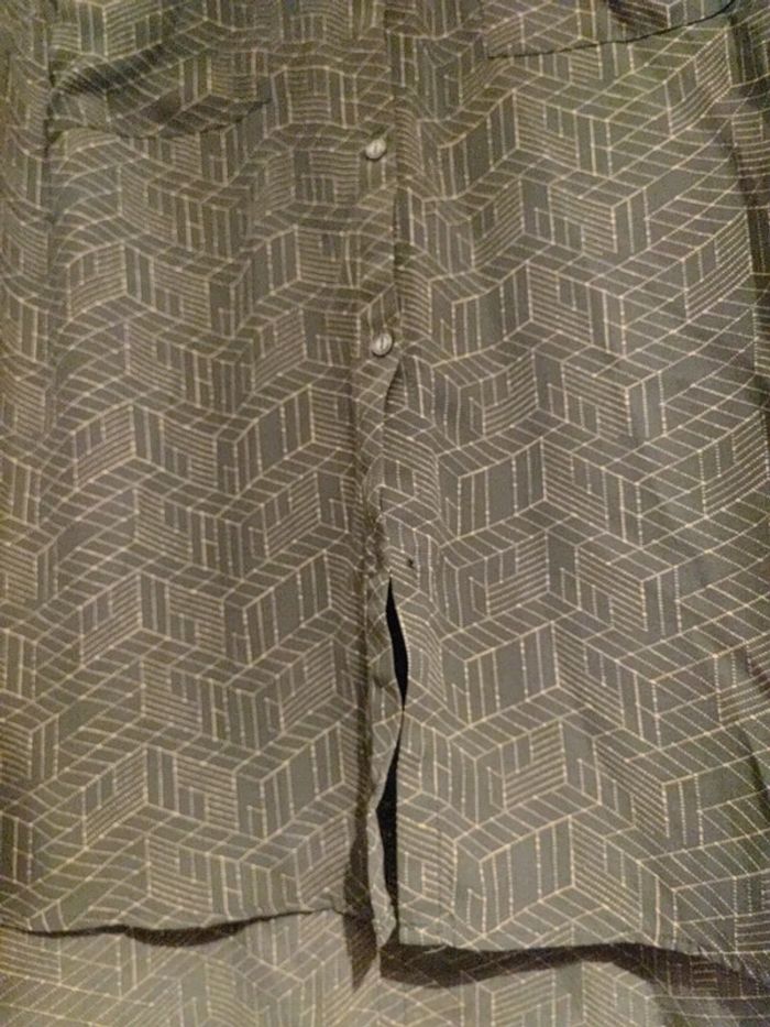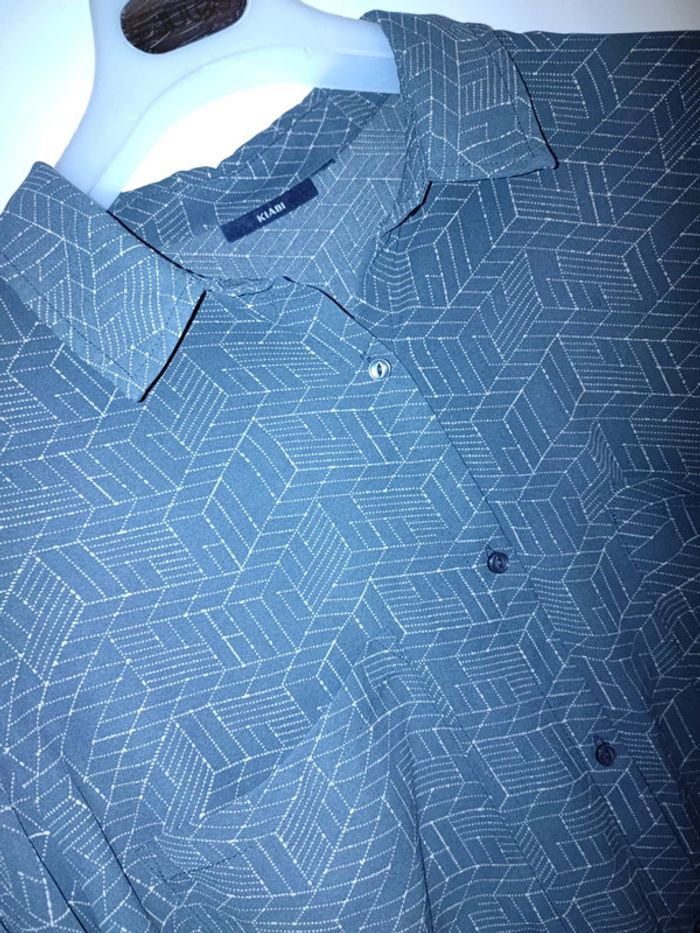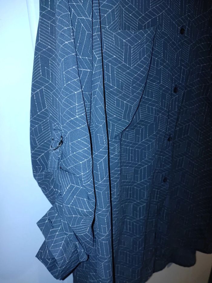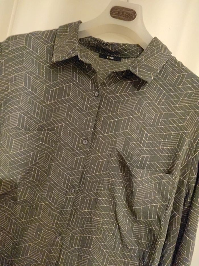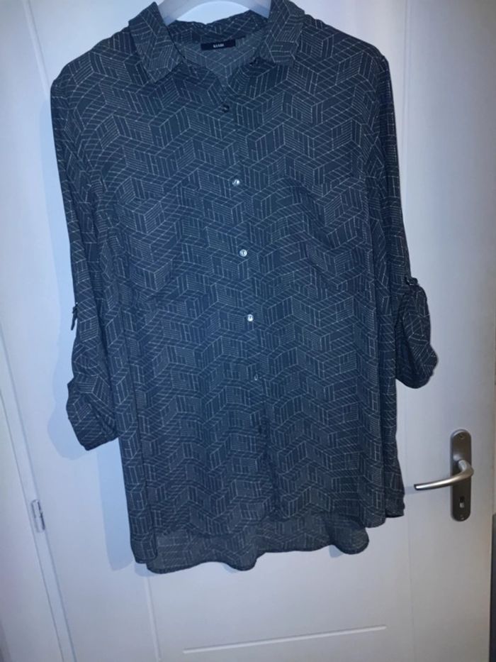 Blouse tunique fluide grise a motifs, les manches peuvent se retrousser, boutons tout le long du dos pour l'originalité, 2 poches poitrine et ouverture a boutons devant Bon Etat, manque juste un petit bouton tout en bas devant Marque kiabi #cyboulette44femme